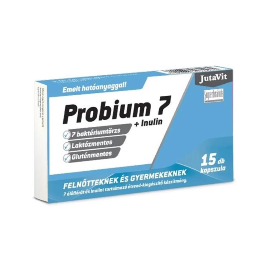 A JutaVit Probium 7 + Inulin termék laktóz- (tejcukor), tejfehérje- és tejmentes, gluténmentes, szójamentes, vegetáriánus termék. Bélflóránk egyensúlyát számos külső hatás felboríthatja. Ilyenkor a bélbaktériumok egy része elpusztulhat. Ennek helyreállításában segíthet a JutaVit Probium 7 + Inulin. Antibiotikumos kezelés étrendi kiegészítése esetén a készítményt az antibiotikum bevételét követően minimum két óra elteltével alkalmazza. A termék hozzáadott inulint tartalmaz. Az inulin természetes, vízben oldódó növényi poliszacharid, amely emésztetlenül jut a vastagbélbe, és a bélflórát alkotó baktériumok táplálékaként szolgál.